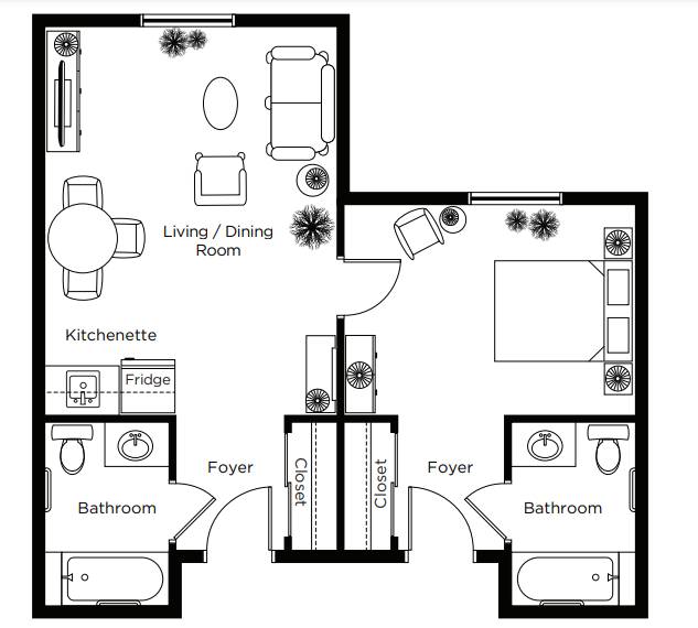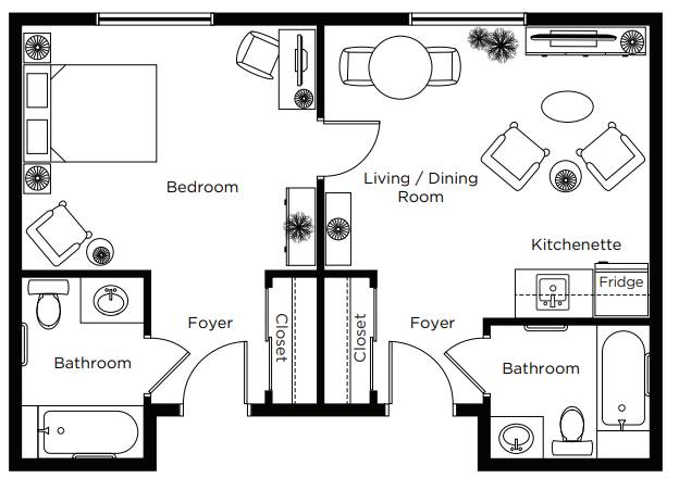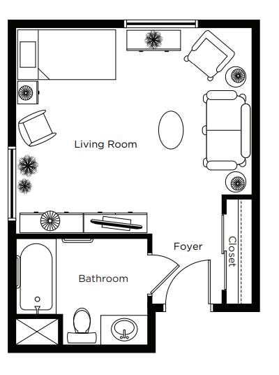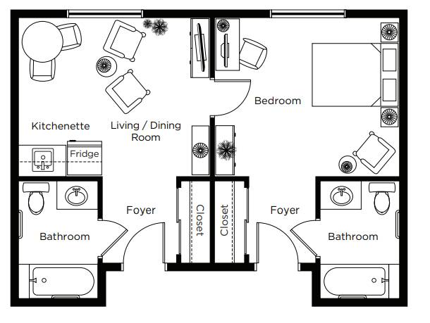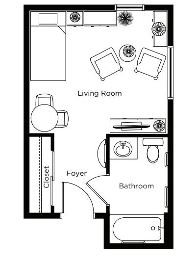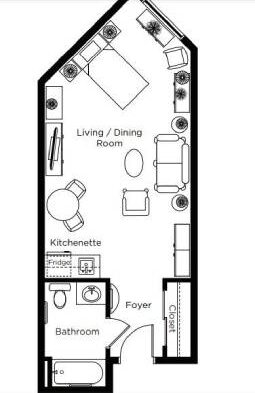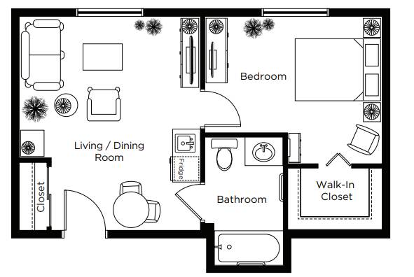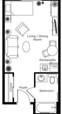 Typically a larger studio with kitchenette and private bathroom with walk-in shower.